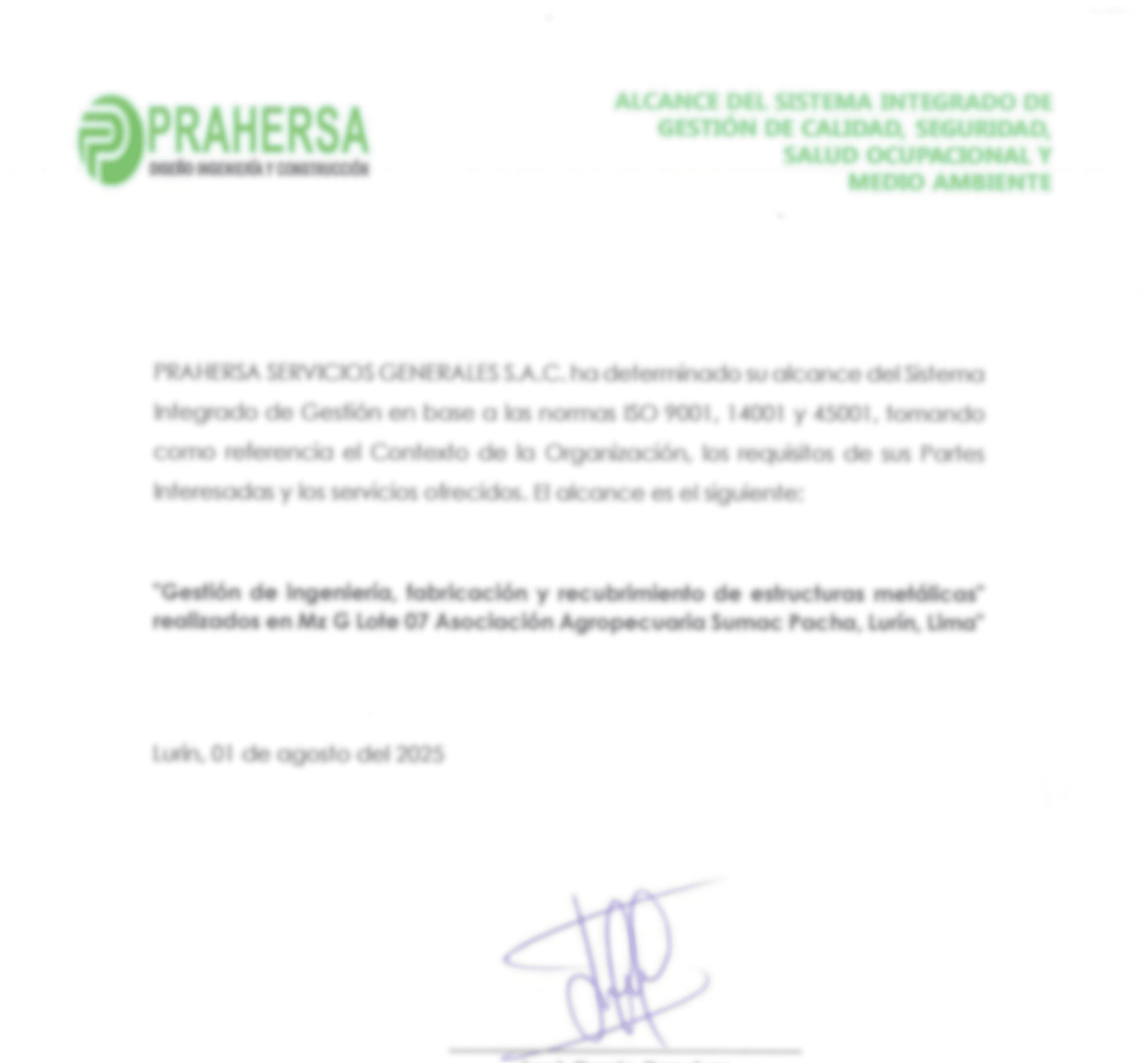 PRAHERSA SERVICIO GENERALES S.A.C., Es una empresa peruana que brinda soluciones integrales a las necesidades de infraestructura de las empresas del sector energía, minería, industrial y comercial. Somos una metal mecánica con gran experiencia en proyectos de estructura metálica, que optimiza de acuerdo a una correcta ingeniería a nivel de detalle las etapas de fabricación y montaje de nuestros proyectos. Nuestros servicios cumplen con todas las normativas y estándares de calidad, seguridad y medio ambiente.